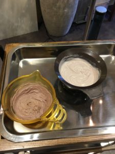 根本用と毛先用に2種類、薬剤をつくりまして、塗っていきます。 目指すは毛先にむけて明るくなっていくグラデーション・カラーです。